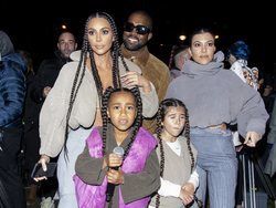 Kim Kardashian, Kanye West, Kourtney Kardashian y las pequeñas North West y Penelope Disick en el desfile de Yeezy otoño/invierno 2020-2021 en París.