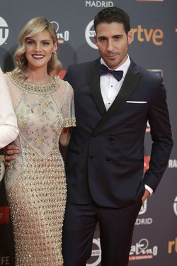 Los actores Miguel Ángel Silvestre y Amaia Salamanca posando juntos en la alfombra roja de los Premios Platino 2017
