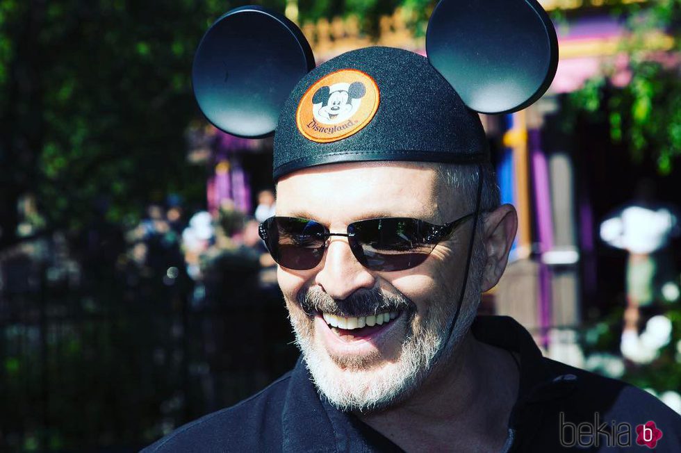 El cantante Miguel Bosé se nota que está disfrutando como un niño de su estancia en Disneyland, y por eso se ha puesto las orejas de Mickey Mouse.