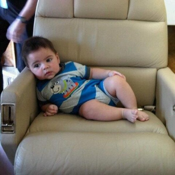 El pequeño Milan Piqué Mebarak muy cómodo en el asiento de un avión