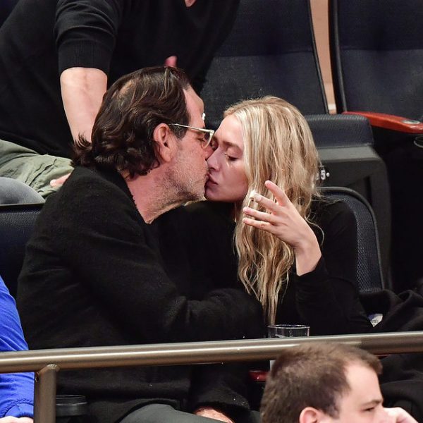 La actriz y diseñadora Ashley Olsen y su novio Richard Sachs besándose durante un partido de la NBA, el 9 de noviembre de 2016.