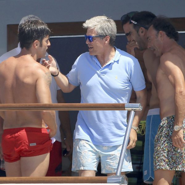 El cantante David Bustamante charlando con los toreros Espartaco y Pepín Liria a bordo de un barco durante unas vacaciones en Ibiza.