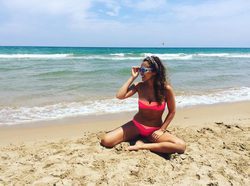 La actriz Paula Echevarría sentada en la arena de la playa de Oliva (Valencia) durante su primera escapada del verano 2016