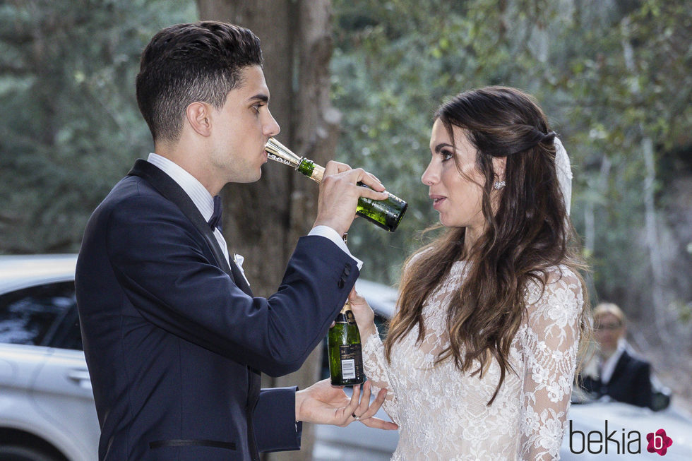 El futbolista Marc Bartra hizo una cobra a su recién estrenada mujer Melissa Jiménez cuando esta le fue a dar un beso tras brindar pero él bebió el champán