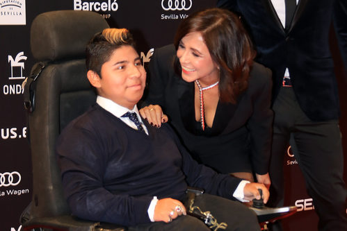 La periodista Isabel Gemio muy pendiente de su hijo Gustavo en la alfombra roja de la entrega de los Premios Ondas 2017.