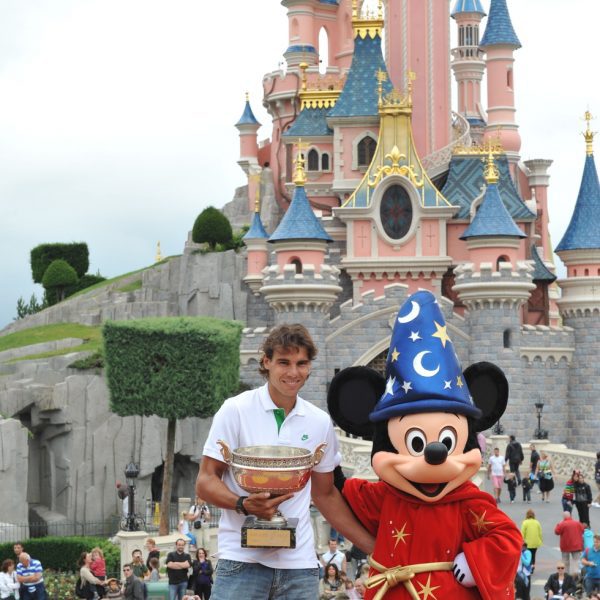 El tenista Rafa Nadal posa con la Copa de Rolland Garros y Mickey en Disneyland París.