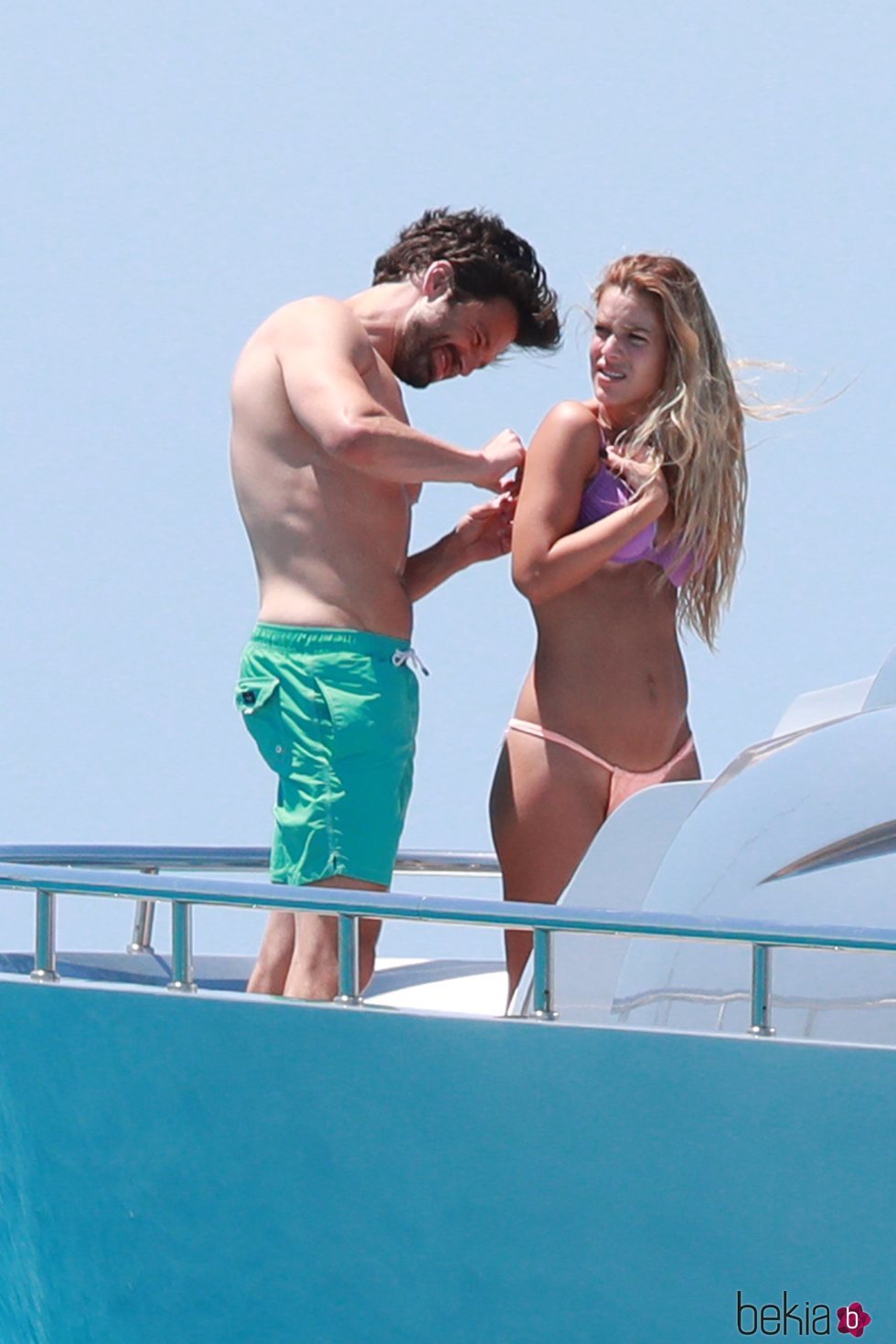 El actor Sebastian Stan colocando el tirante del bikini a la actriz Alejandra Onieva durante sus vacaciones en un yate en Ibiza.