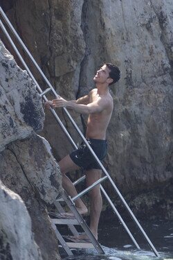 Manu Ríos es fotografiado subiendo por una escalera en Antibes, Francia, para llegar a un trampolín de la playa.