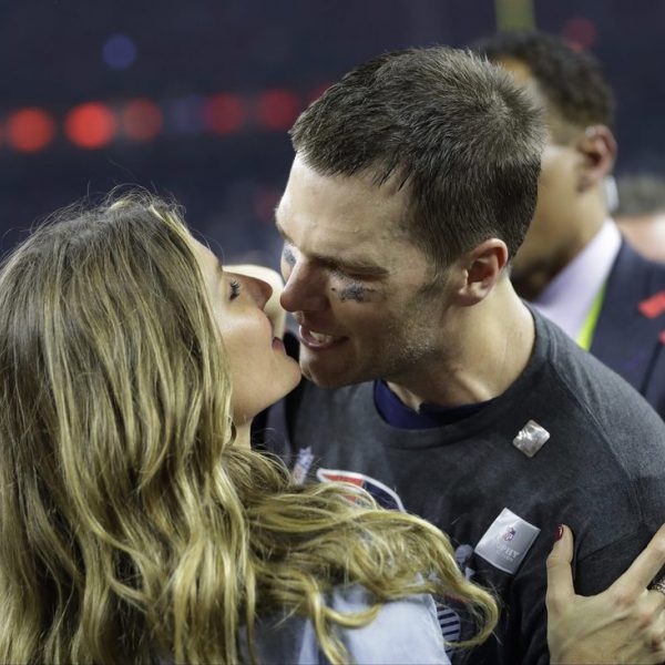 La modelo Gisele Bundchen besando a su marido el jugador de fútbol americano Tom Brady tras la victoria de los Patriots en la Super Bowl 2017