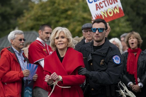 Jane Fonda siendo arrestada por tercera vez en las escaleras del Capitolio de Washington por sus protestas contra el cambio climático.