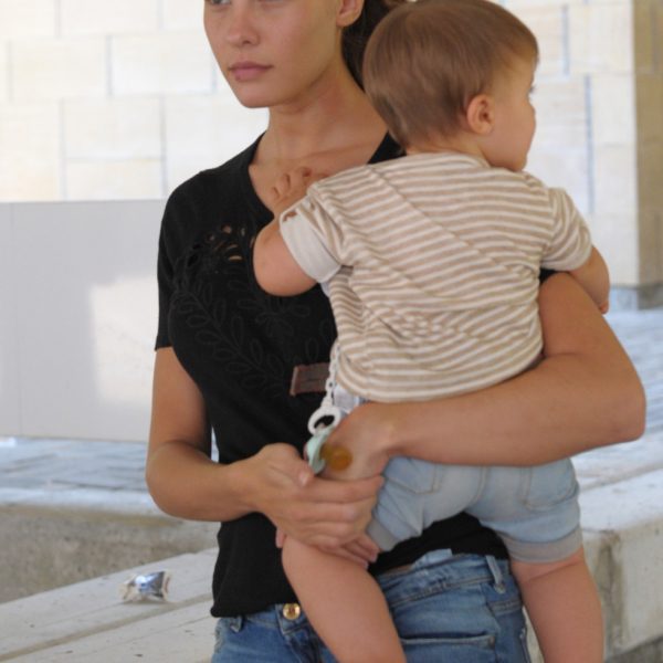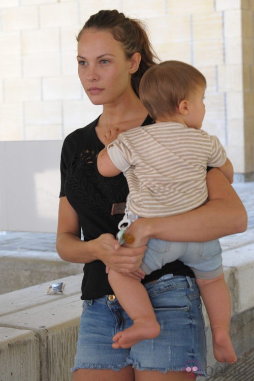 La modelo Jessica Bueno a su llegada a Sevilla con su hijo Francisco.