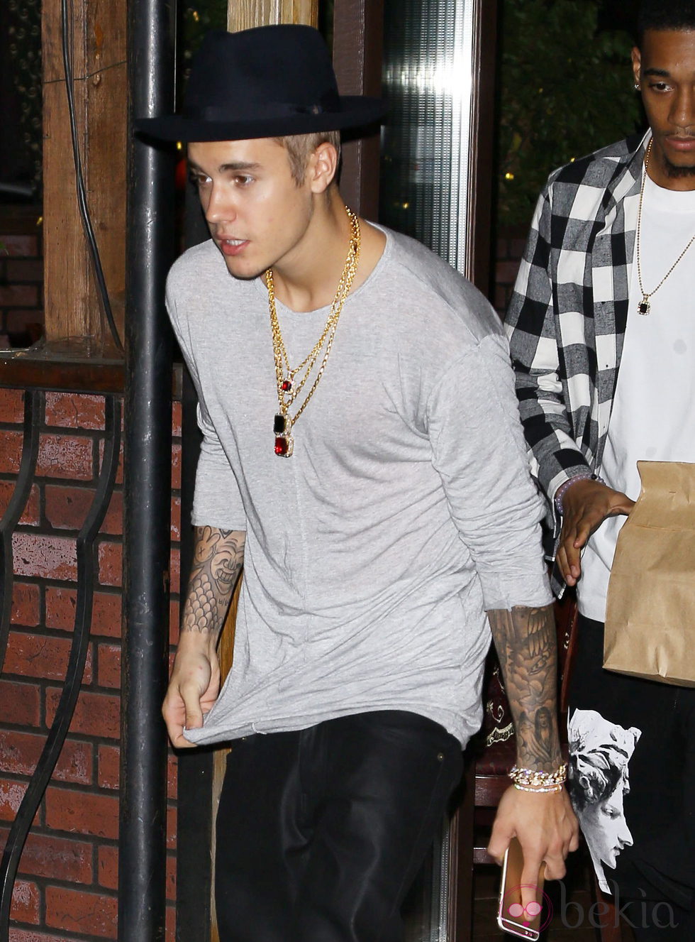 El cantante canadiense Justin Bieber abandona un restaurante en Los Ángeles.