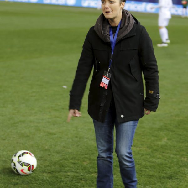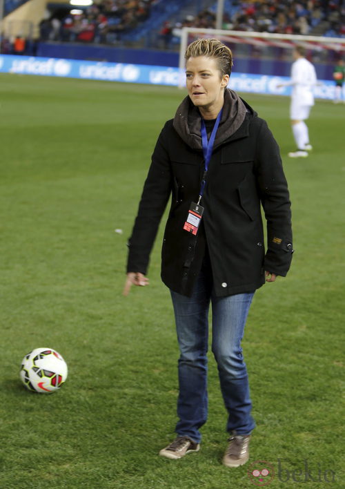 La periodista María Casado haciendo el saque de honor del partido Champions for Life 2014