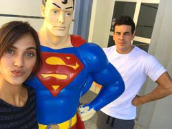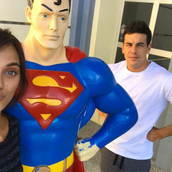 El actor Mario Casas y la modelo Dalianah Arekion posan sonrientes en una fotografía junto a una figura de Superman.