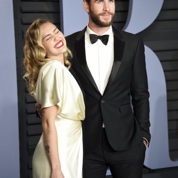 La pareja formada por Miley Cyrus y Liam Hemsworth posando juntos y sonrientes en la alfombra roja de la fiesta Vanity Fair posterior a la gala de entrega de los Oscar 2018.