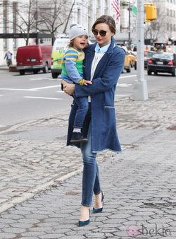 La modelo Miranda Kerr con su hijo Flynn en brazos paseando por Nueva York