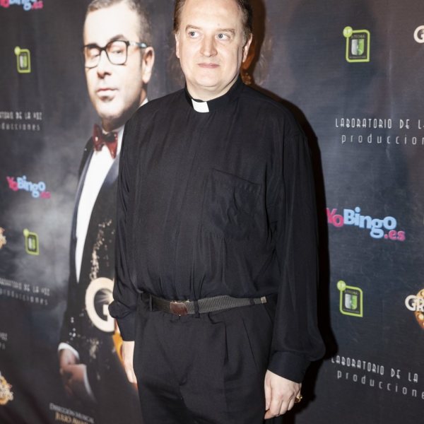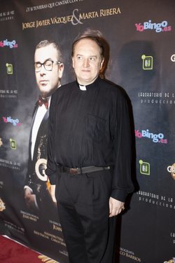 El Padre Apeles es fotografiado acudiendo al estreno de la obra de teatro de Jorge Javier Vázquez y posa en el photocall.