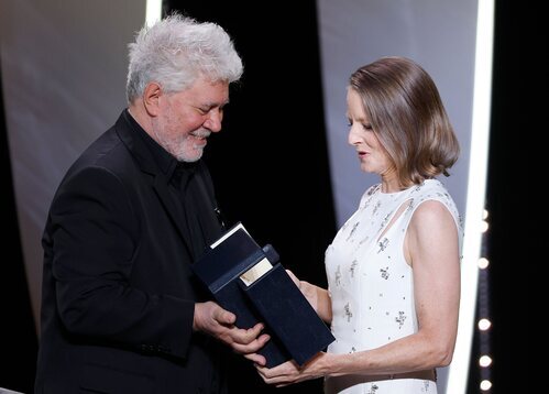 El director de cine Pedro Almodóvar ha sido el encargado de hacer entrega a Jodie Foster de su Palma de Oro de Honor en el Festival de Cannes 2021.
