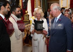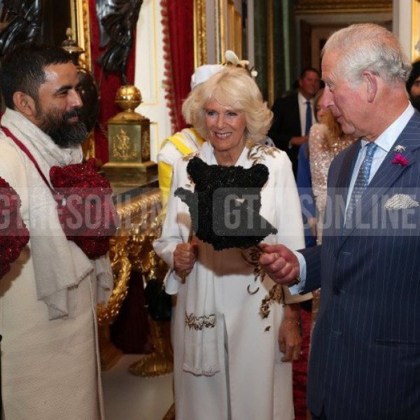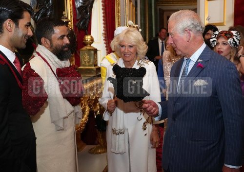 El Príncipe de Gales y la Duquesa de Cornualles hablando con unos invitados entre risas y miradas de complicidad.