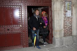 Regina do Santos y Pablo Sebastián, amigos de la cantante Yurena, saliendo de la ermita Virgen del Puerto en Madrid en la misa funeral de Margarita Seisdedos