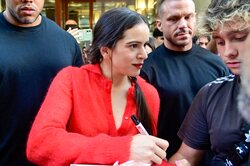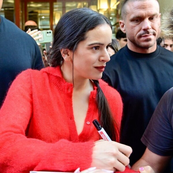La cantante Rosalía ha acudido a una emisora de radio en Madrid y antes de entrar ha firmado muchos autógrafos a sus fans.