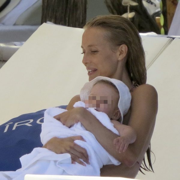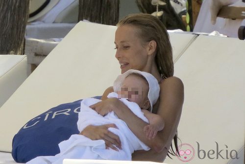 La modelo Vanesa Lorenzo descansa a la sombra con su hija Manuela durante un día de playa en Ibiza.