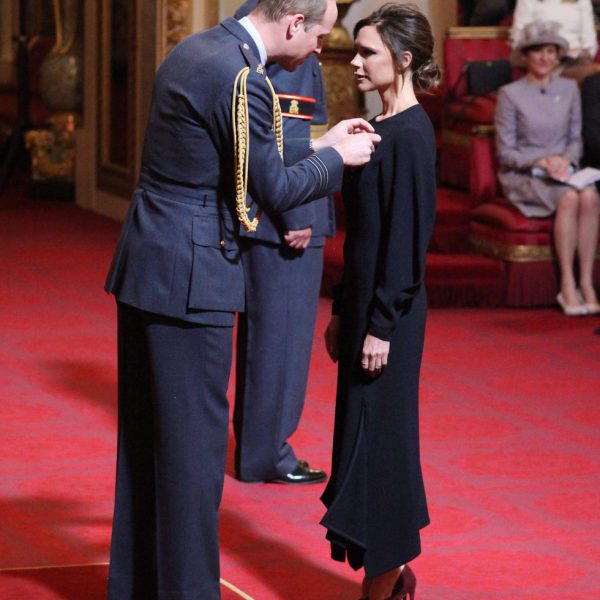 Victoria Beckham recibe la condecoración de la Orden del Imperio Británico de la mano del Duque de Cambridge.