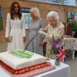 La Reina Isabel cortando una tarta junto a Camilla Parker y Kate Middleton en 'The Big Lunch' en la ...
