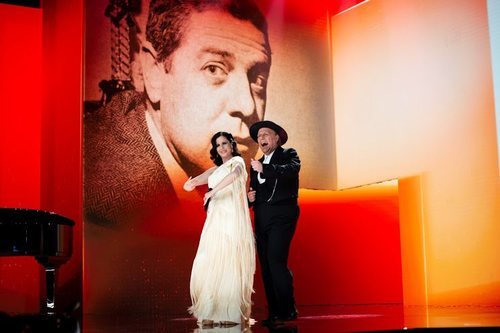 Carlos Latre y Diana Navarro son fotografiados durante su actuación en homenaje a Berlanga en los Premios Goya 2021.