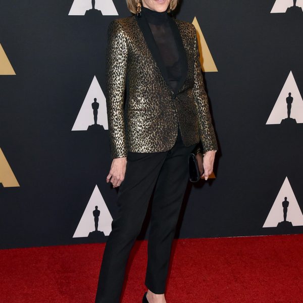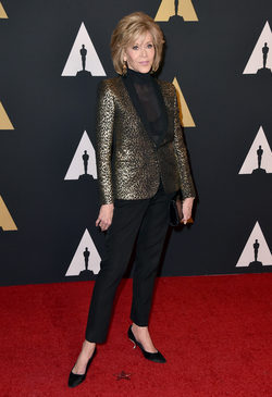 Jane Fonda en la entrega de premios Governors Awards 2015 con un traje compuesto de pantalón y chaqueta.