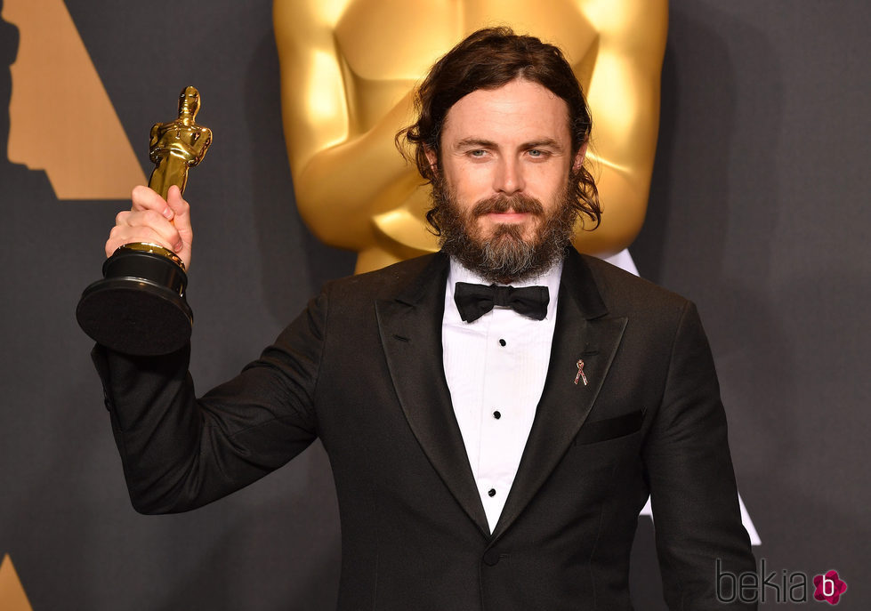 El intérprete Casey Affleck posando con su Oscar 2017 a Mejor actor por 'Manchester frente al mar' tras dar su discurso