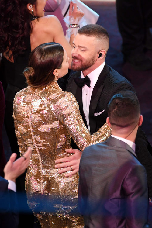 El cantante Justin Timberlake con su mujer Jessica Biel durante su actuación en la entrega de los Premios Oscar 2017