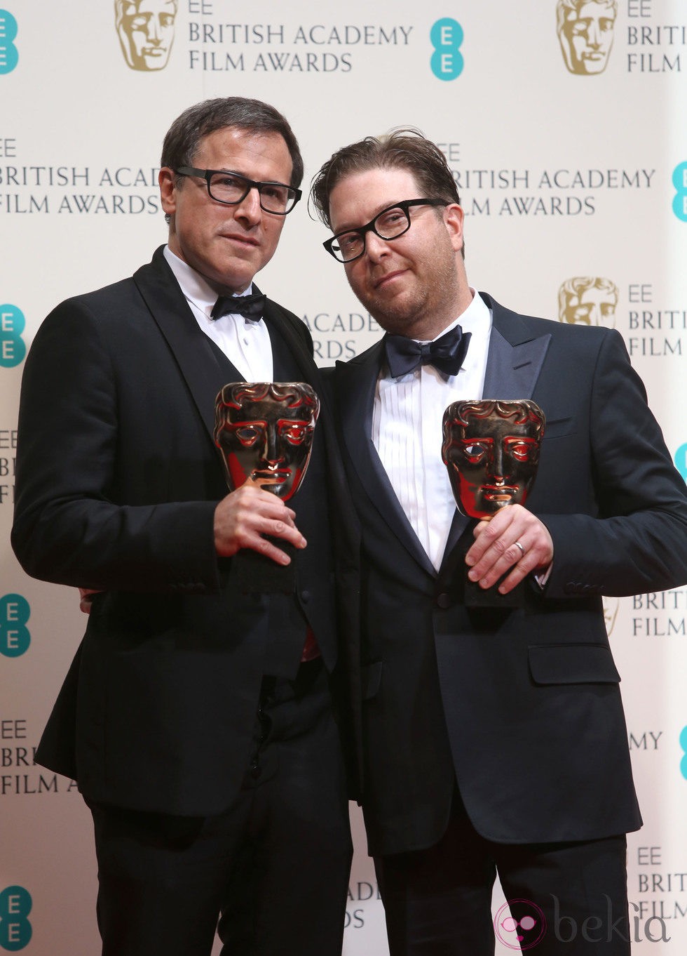 El director David O. Russell y Eric Warrensinger posan con su premio BAFTA 2014 al mejor guion original.