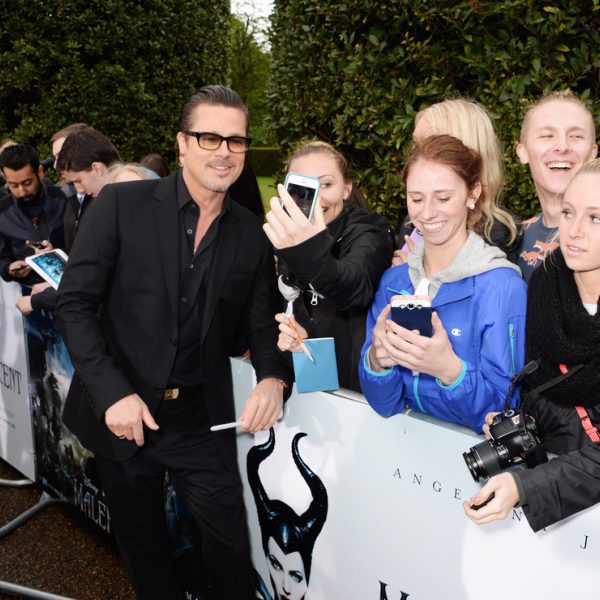 El actor Brad Pitt atiende a los fans en la premiere de 'Maléfica' en Londres.