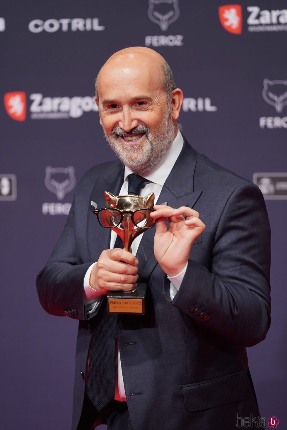 El actor Javier Cámara posa con el Premio Feroz 2022 obtenido a Mejor Actor de televisión por la serie 'Vota Juan'.
