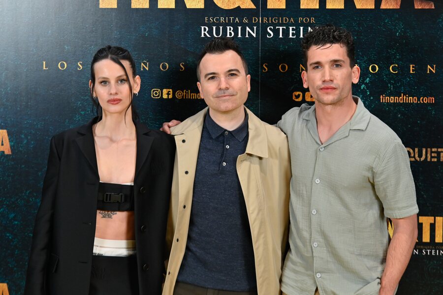 Los actores protagonistas Milena Smit y Jaime Lorente y el director Rubin Stein en la presentación ante la prensa de su última película, 'Tin&Tina'