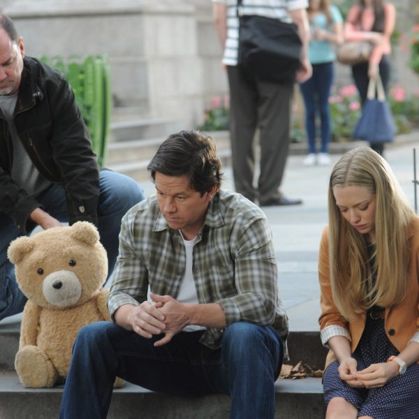 El oso de peluche junto a los actores Mark Wahlberg y Amanda Seyfried en el rodaje de la película 'Ted 2'.