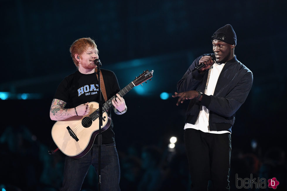 El cantante Ed Sheeran acudió a la entrega de Premios Brit Awards 2017 donde subió al escenario y cantó junto al rapero Stormzy.