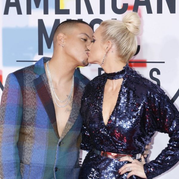 La pareja formada por el actor Evan Ross y la cantante Ashlee Simpson besándose en la alfombra roja de los American Music Awards 2018.
