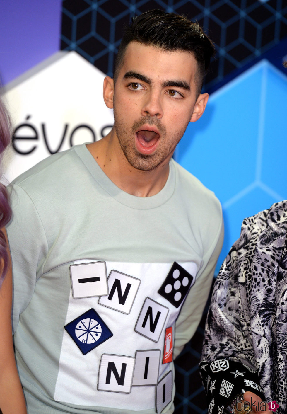 El cantante Joe Jonas abriendo la boca mientras posaba en la alfombra roja de los MTV EMA 2016 junto a su banda DNCE