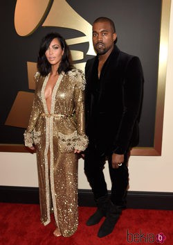 La pareja formada por Kim Kardashian y Kanye West, posando juntos a su llegada a los Premios Grammy 2015.