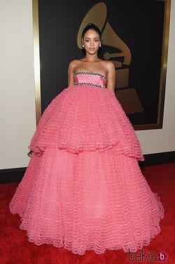 La cantante Rihanna sorprende con un vestido rosa chicle en la alfombra roja de los Premios Grammy 2015.