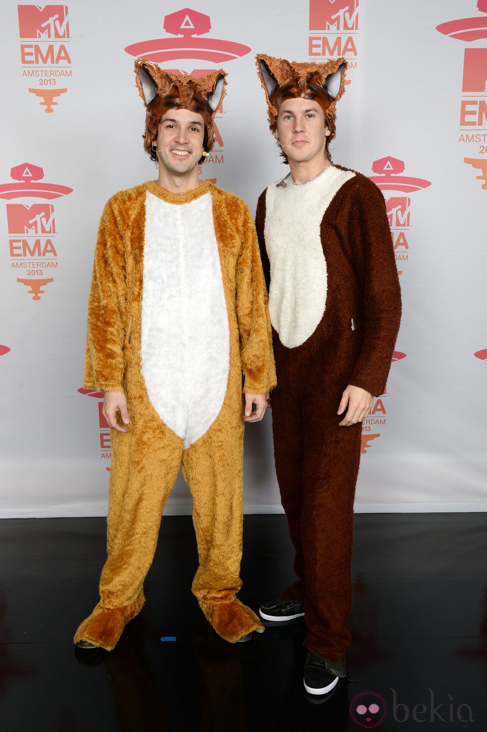 Bard Ylvisaker y Vegard Ylvisaker de Ylvis, autores del éxito 'What does the fox say?' en la alfombra roja de los MTV Europe Music Awards 2013.