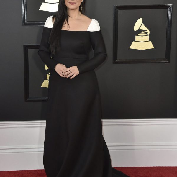 La cantante italiana Laura Pausini posando un espectacular vestido negro y blanco en la alfombra roja de los Premios Grammy 2017.
