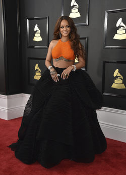 La cantante Rihanna en su llegada a la alfombra roja de los Premios Grammy 2017. La artista escogió un top naranja junto a una voluminosa falda negra.