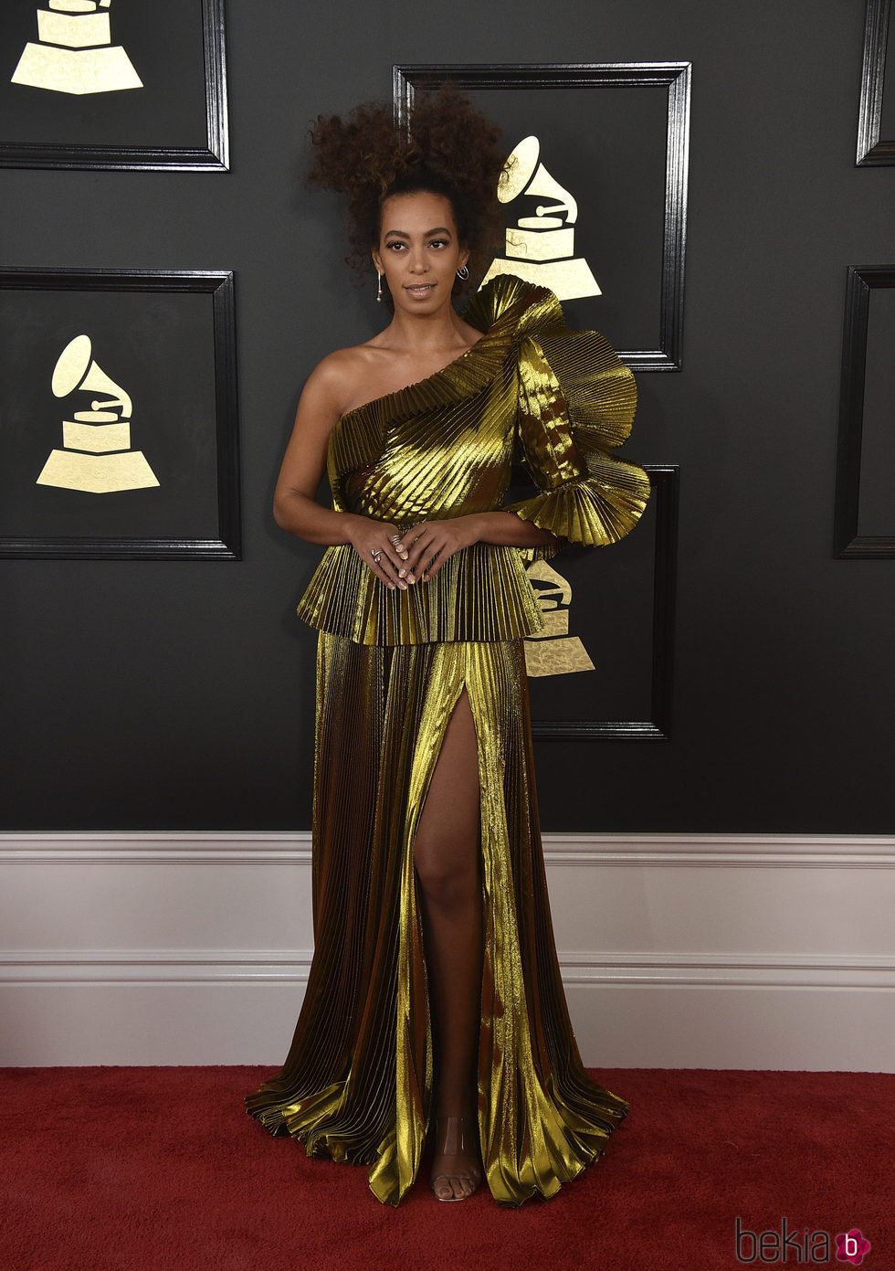 La cantante Solgne Knowles en posando ante los medios en la gala de los Premios Grammy 2017. La artista escogió un vestido de color dorado.