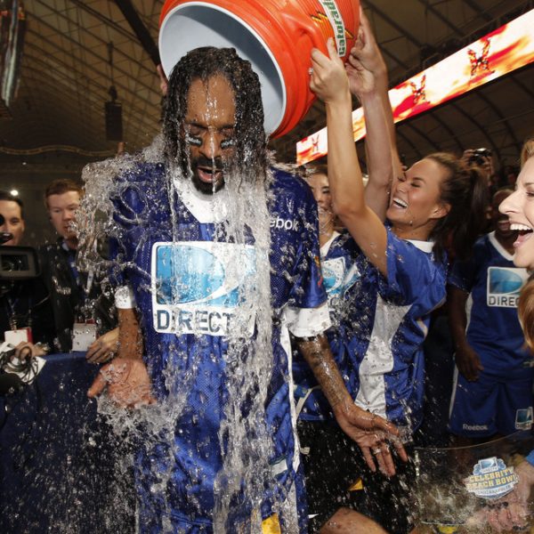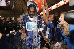 Snoop Dogg empapado tras lanzarle un cubo de agua en la Celebrity Beach Bowl 2012 en Indianapolis.