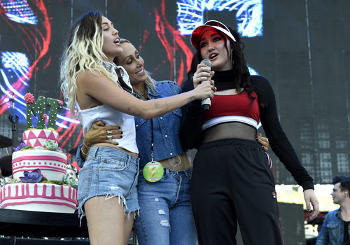 Noah y Miley Cyrus felicitando a su madre en el escenario del Festival Wango Tango 2017 donde ambas eran cabeza de cartel