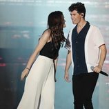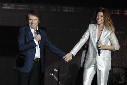 Raphael tiene cogida de la mano a Miriam durante el concierto de 'OT Bernabéu'. Cantó con los concursantes y tuvieron mucha conexión.
