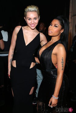 Las cantantes Miley Cyrus y Nicki Minaj en los premios Grammy 2015 celebrados en el Staples Center de Los Ángeles.